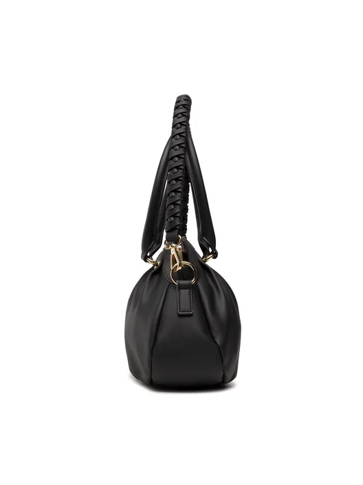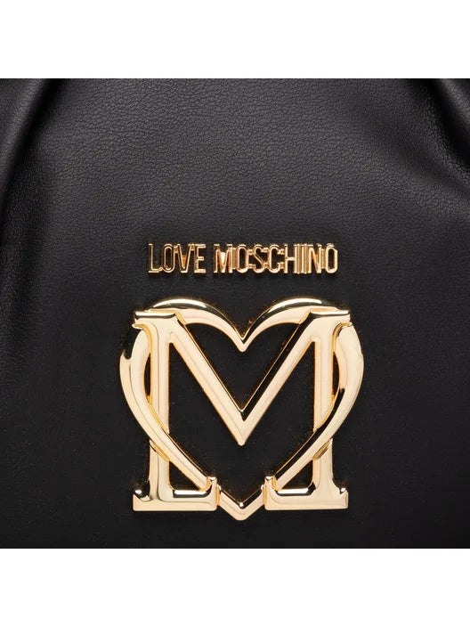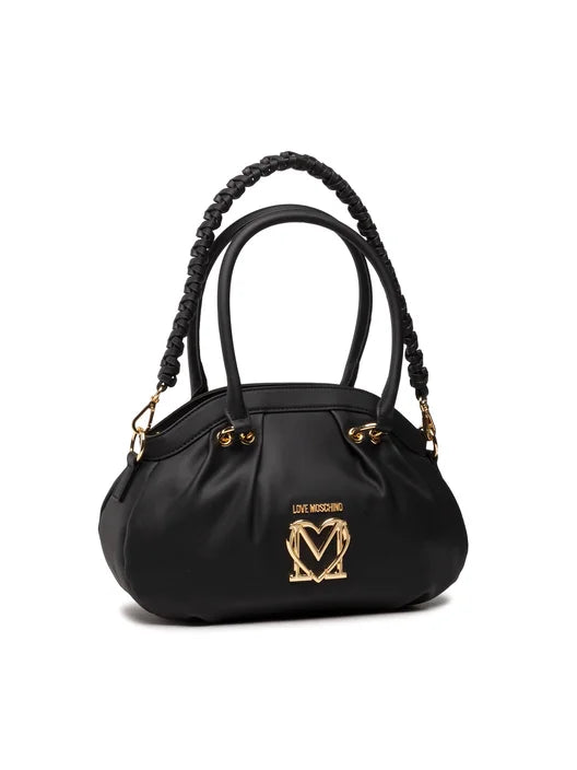 أنيق وأنيق حقيبة يد سوداء من لوف موسكينومصنوع من الجلد الصناعي الناعم مع صورة ظلية دائرية ناعمة. تتميز بمقابض علوية مزدوجة مع تفاصيل مجمعة، وأجزاء صلبة ذهبية اللون، وجريئة أحب شعار موسكينو "M". على الجبهة. واسعة وأنيقة، مثالية للارتداء اليومي وللإطلالات المسائية.