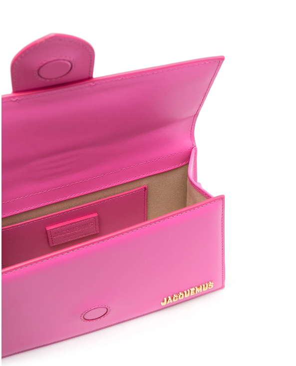 A bold and stylish Jacquemus Le Bambino Long Bag in vibrant pink, crafted from smooth premium leather. Designed with the brand’s signature elongated silhouette, a structured top handle, and a detachable crossbody strap for versatile wear. Finished with a sleek flap closure and gold JACQUEMUS logo for a modern luxury touch.